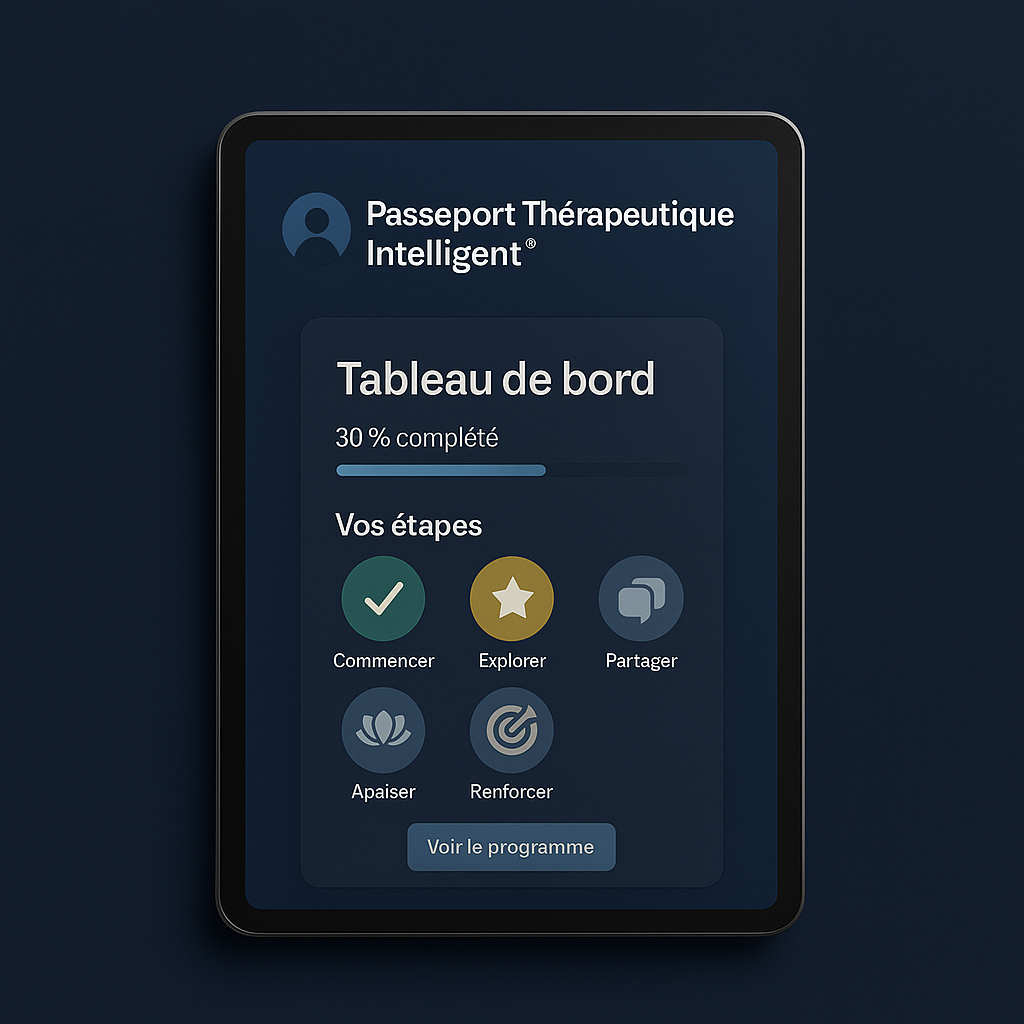 Le Passeport Thérapeutique Intelligent® vous donne accès à votre tableau de bord personnel : badges, étapes validées, journal d’évolution, et recommandations sur mesure.